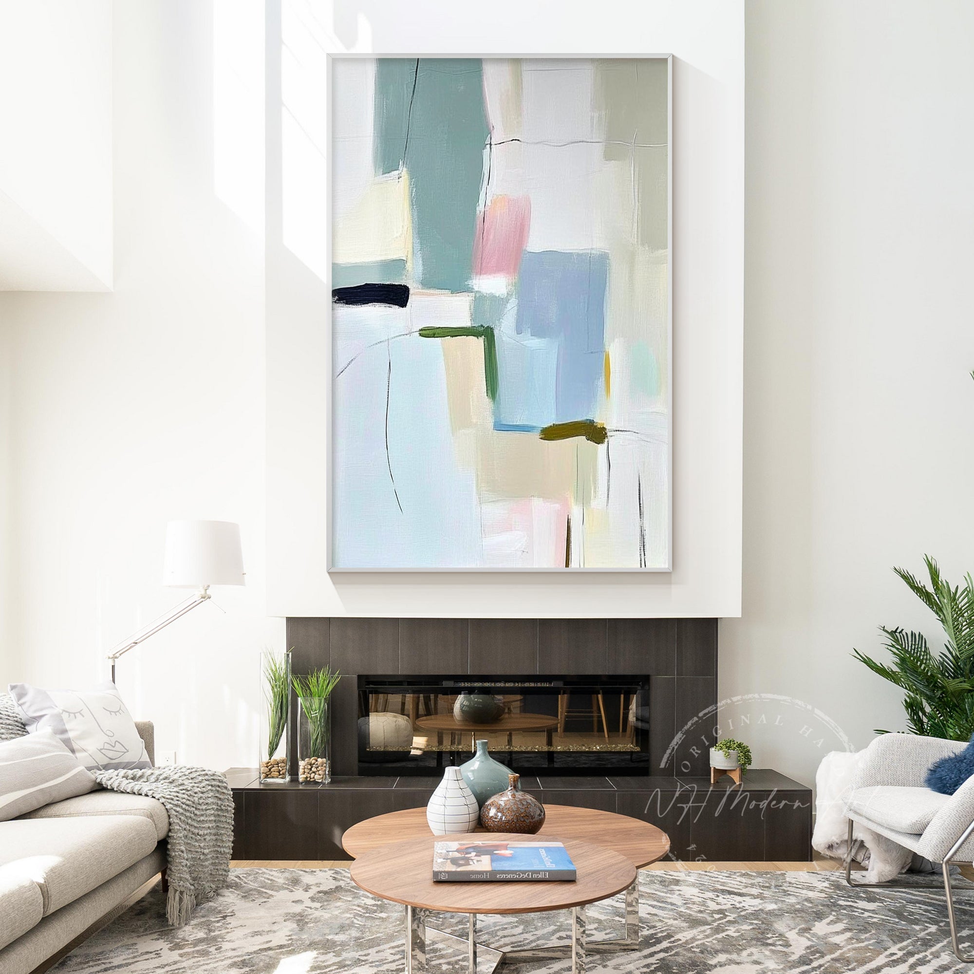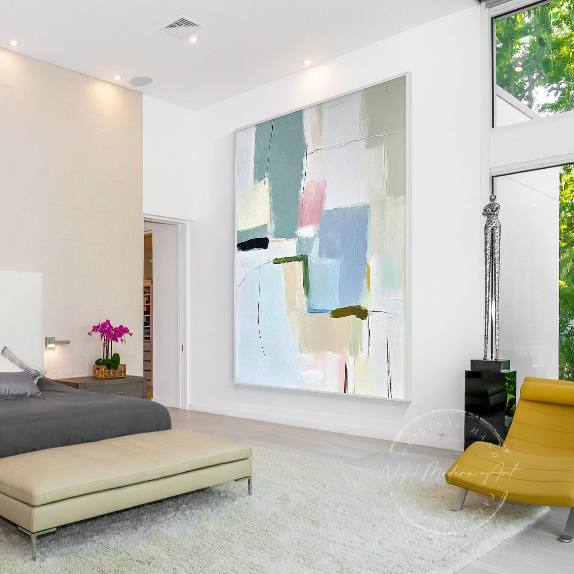 Large rooms or high ceilings need bold, oversized artwork to avoid looking underwhelming. One of the most common mistakes is hanging art that’s too small for the wall.