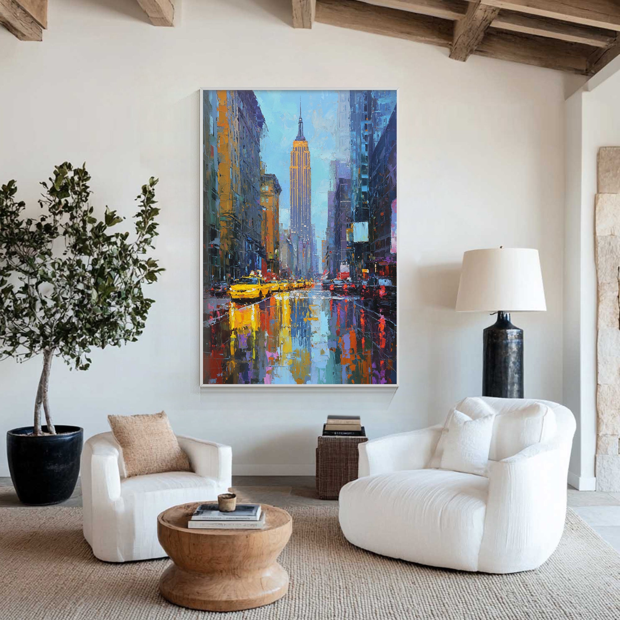 Which comes first — the artwork or the interior design? If you’re starting with a blank canvas and find a beautiful piece of art you love, let it set the tone for your entire space. Use cushions, throws, rugs, and décor to complement the colors in the artwork. This approach creates a cohesive, harmonious look.
